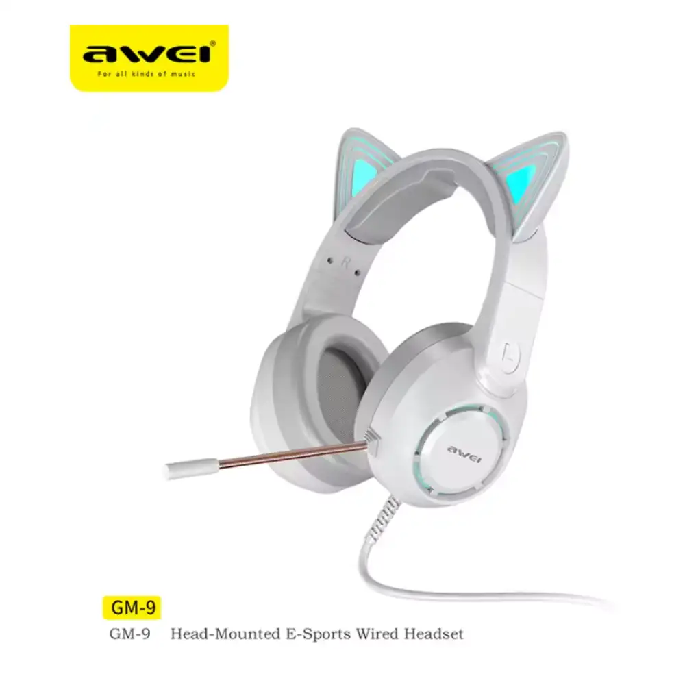 Auriculares Awei GM-9 con luces flash estilo orejas gato, sonido estéreo HD, micrófono con cancelación y cable reforzado perfectos para gaming, deporte y uso diario en blanco.