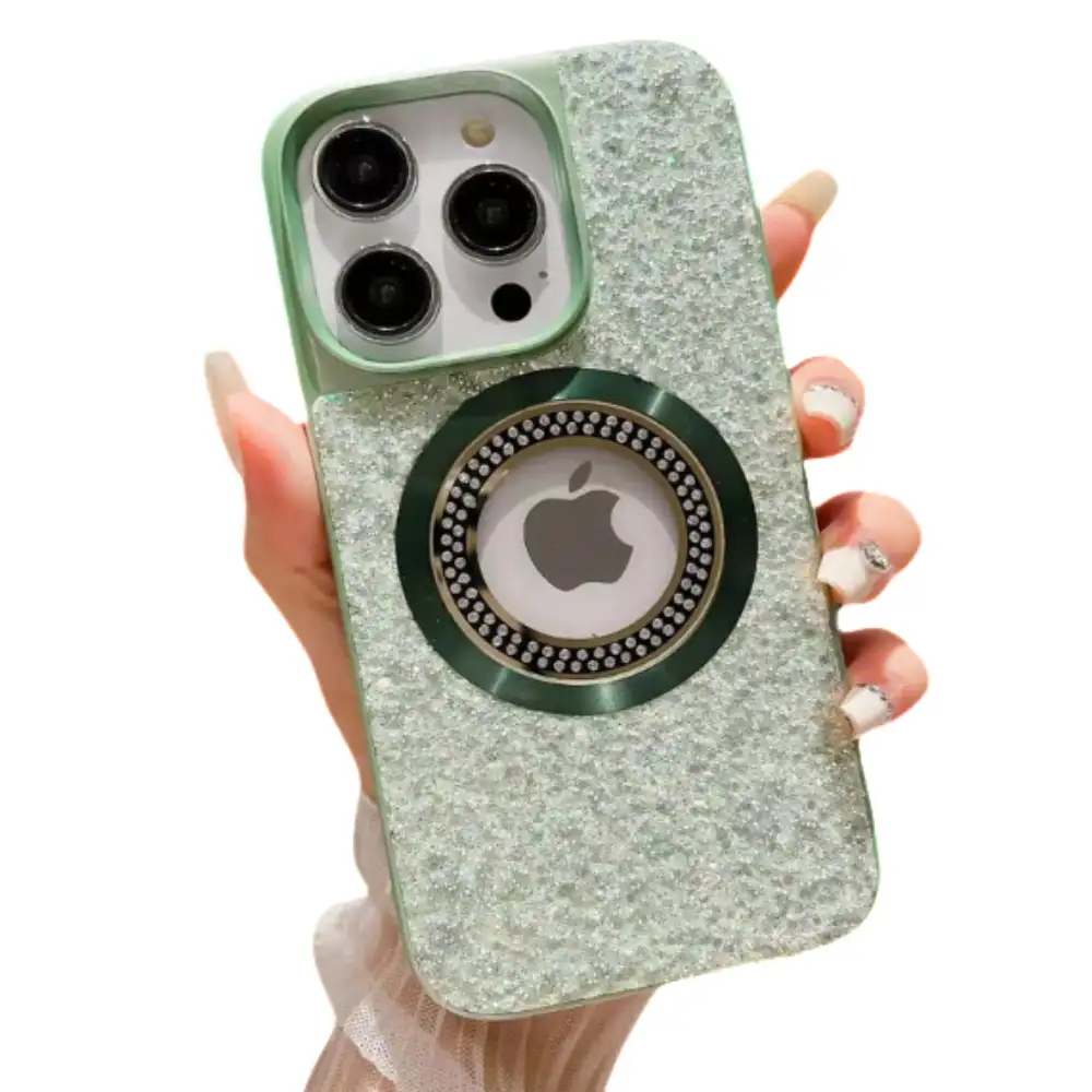 Cover Magsafe Glitter para iPhone 15 Pro Max en vibrante verde glitter, diseño ultrafino con alineación perfecta de imanes, acabado brillante resistente a rayones y compatible con carga inalámbrica rápida