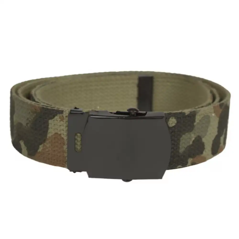 Cinturón de algodón Mil‑Tec con hebilla negra estilo militar, resistente y cómodo, ideal para uso diario y actividades al aire libre, combina durabilidad, estilo urbano y versatilidad en un accesorio de alta calidad para hombres y mujeres