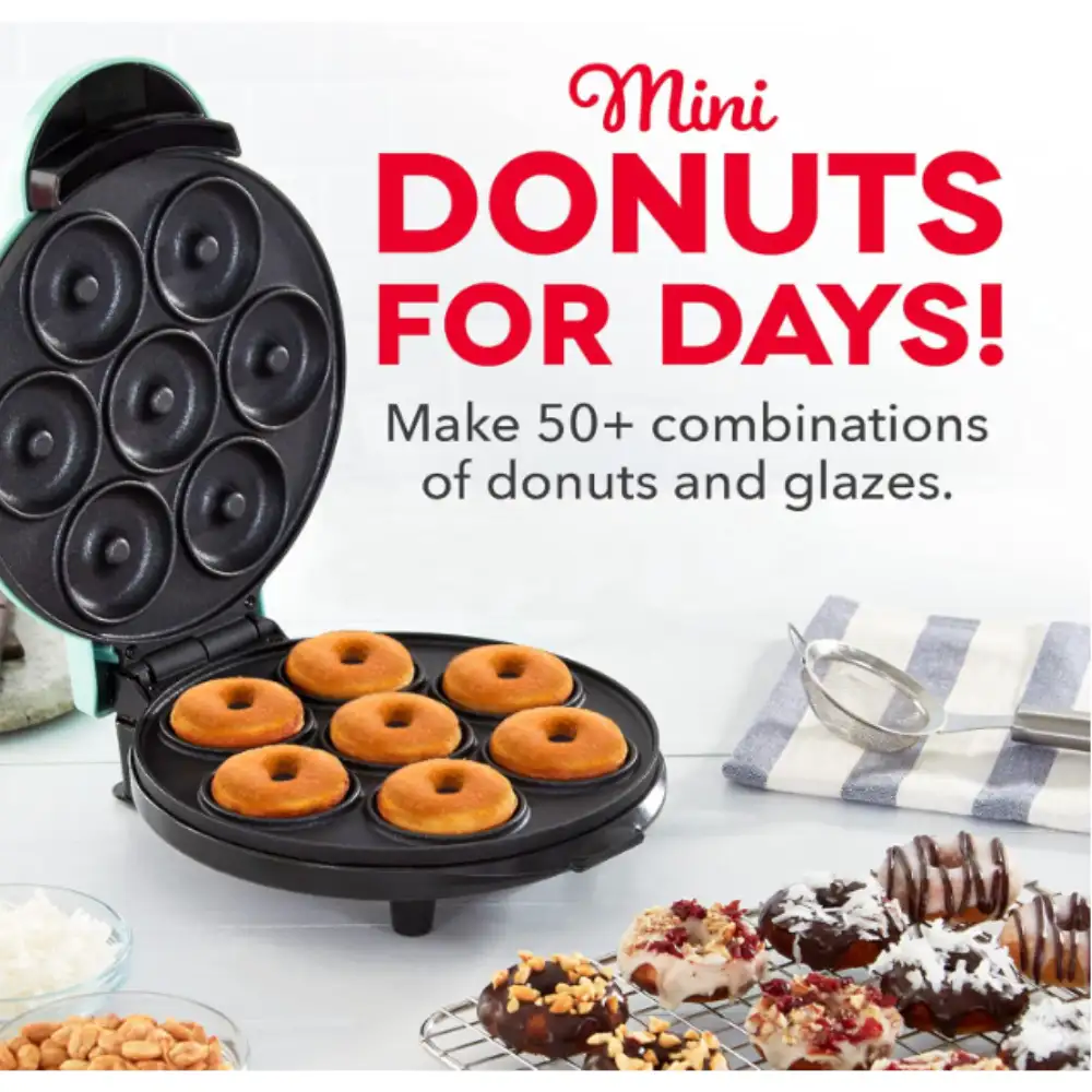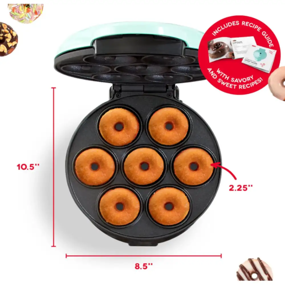 Prepara donas caseras en minutos con la Mini Donut Maker turquesa, sin aceite y con temporizador diseño compacto para desayunos, meriendas y eventos.