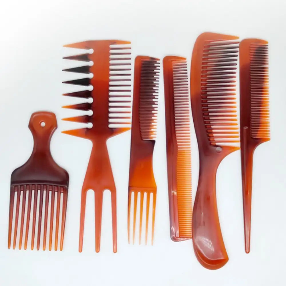 Set de 6 peines de acetato con mangos antideslizantes y tamaños variados, ideal para todo tipo de cabello perfectos para uso profesional y doméstico.