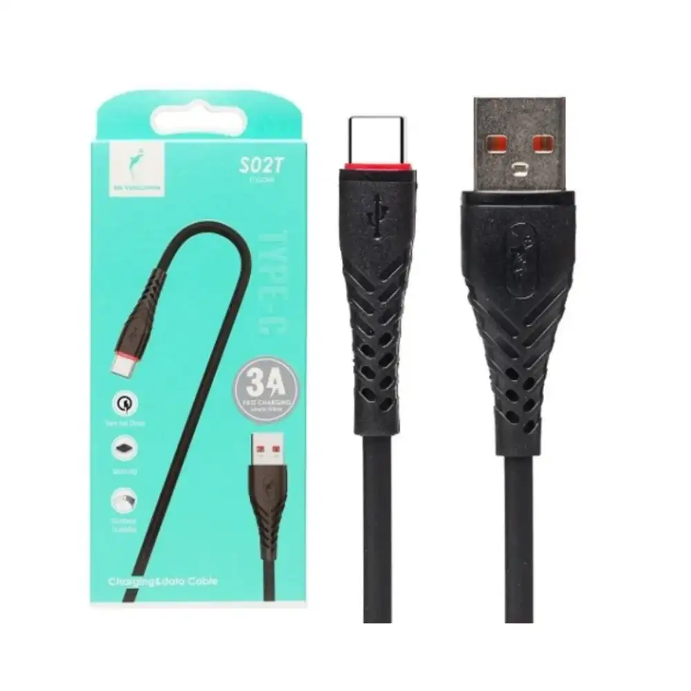 Cable USB Tipo C S02T de 1 metro, color negro, con revestimiento trenzado, ofrece carga rápida y transferencia de datos a alta velocidad, compatible con smartphones, tablets y laptops con puerto USB‑C, ideal para uso diario y viajes.