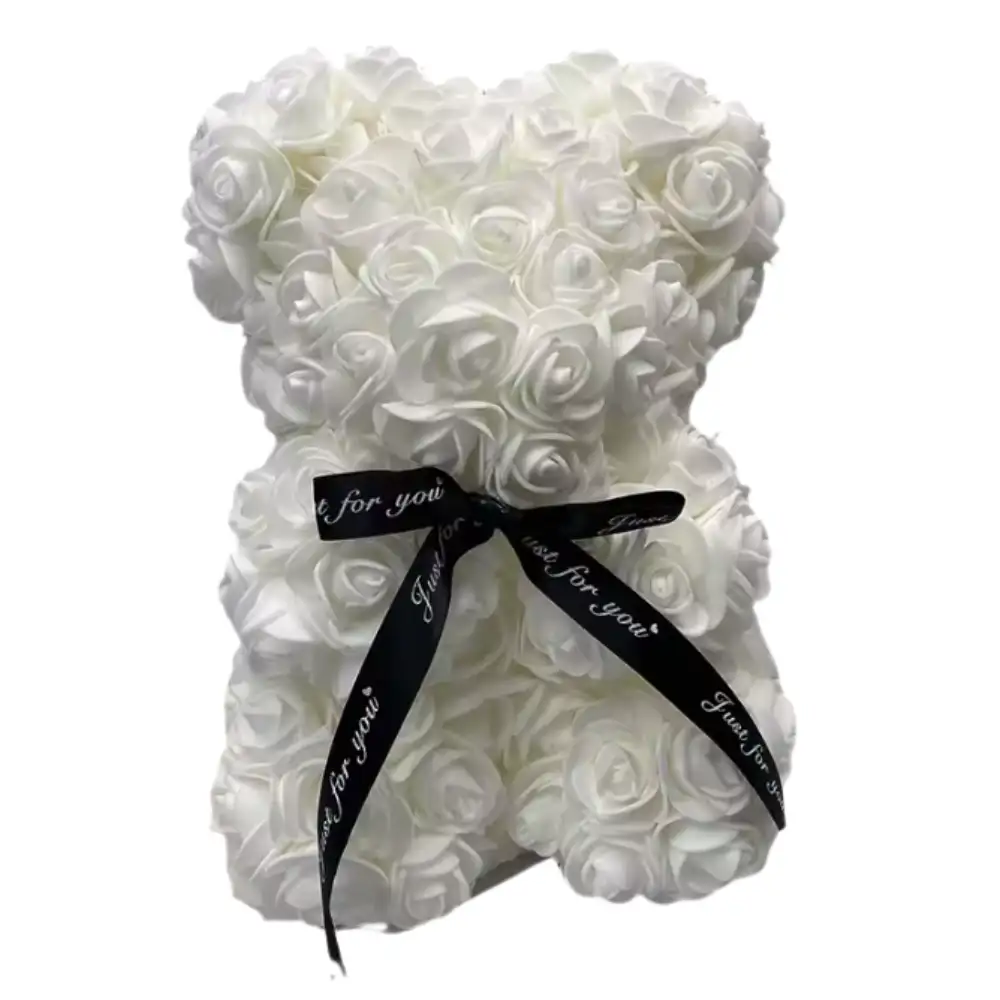 • Cada Oso de rosas está meticulosamente elaborado a mano por artesanos expertos, quienes disponen cientos de delicadas flores sintéticas blancas sobre una estructura de peluche de alta calidad. El proceso incluye selección cuidadosa de cada pétalo, asegurando una apariencia realista, uniforme y resistente al paso del tiempo, lo que garantiza que el detalle artesanal se mantenga impecable en cualquier entorno.