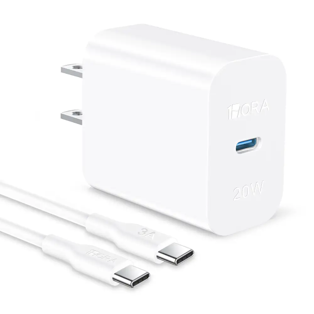 Cargador de pared USB‑C 20 W en blanco, con carga rápida de 1 hora, compatible con smartphones, tablets y laptops, diseño compacto y protección total, ideal para uso diario y viajes.