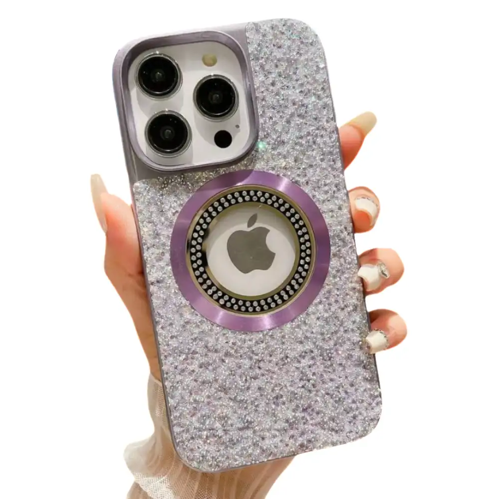 Cover Magsafe Glitter para iPhone 15 Pro Max en vibrante morado glitter – Compatibilidad total con carga inalámbrica, alineación perfecta de imanes, diseño ultra delgado y resistente a rayones, acabado brillante que destaca tu estilo premium