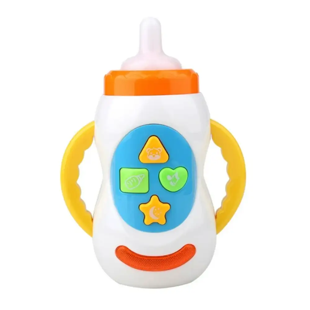 Biberón de juguete interactivo en blanco, sin BPA, con sonido y música, estimula el desarrollo motor y sensorial de niños pequeños, ideal como regalo educativo.