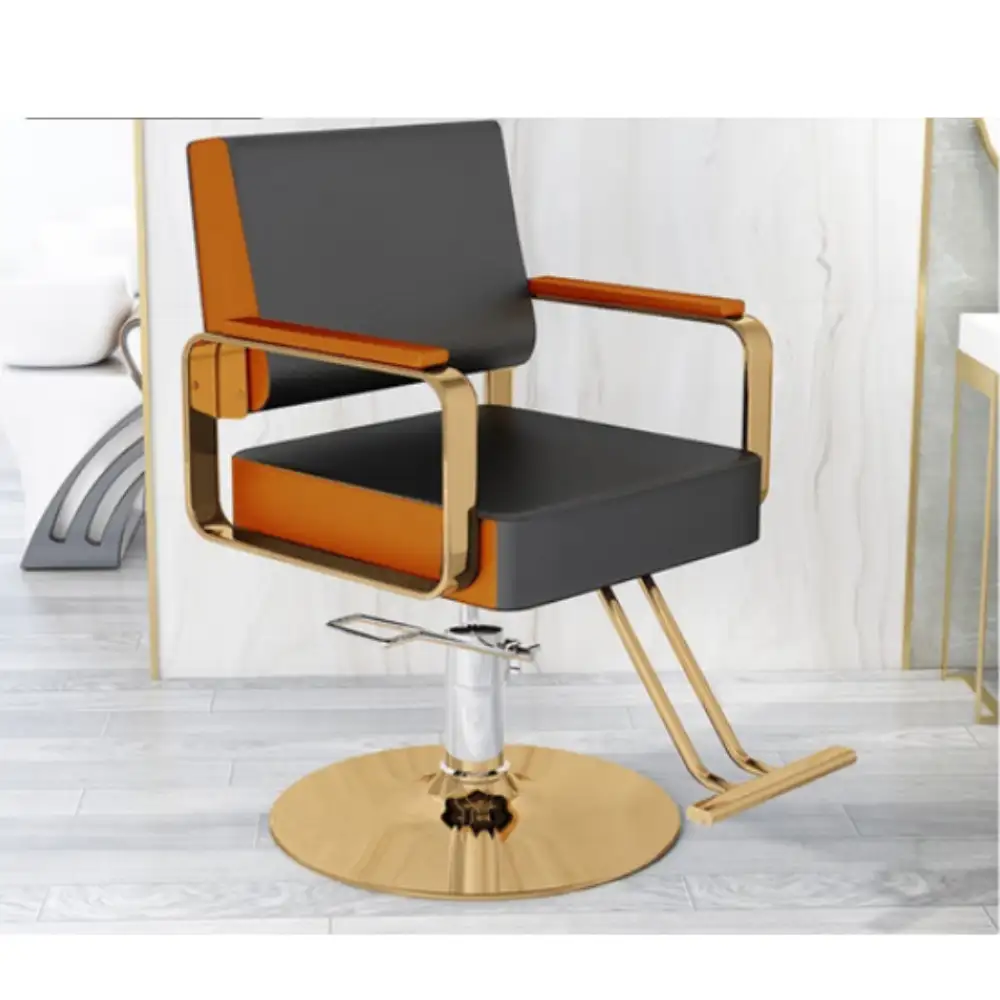 Silla profesional para salón de belleza en negro con naranja y base dorada de acero inoxidable, sin reclinación, ofrece comodidad, estabilidad y estilo moderno para estilistas exigentes.