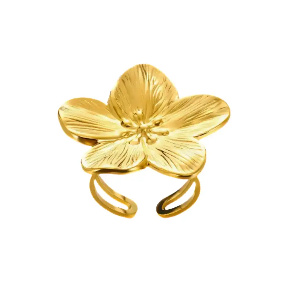 Sortija ajustable de acero inoxidable con diseño floral, resistente al desgaste, perfecta para cualquier talla y ocasión, unisex, ideal para regalo elegante.