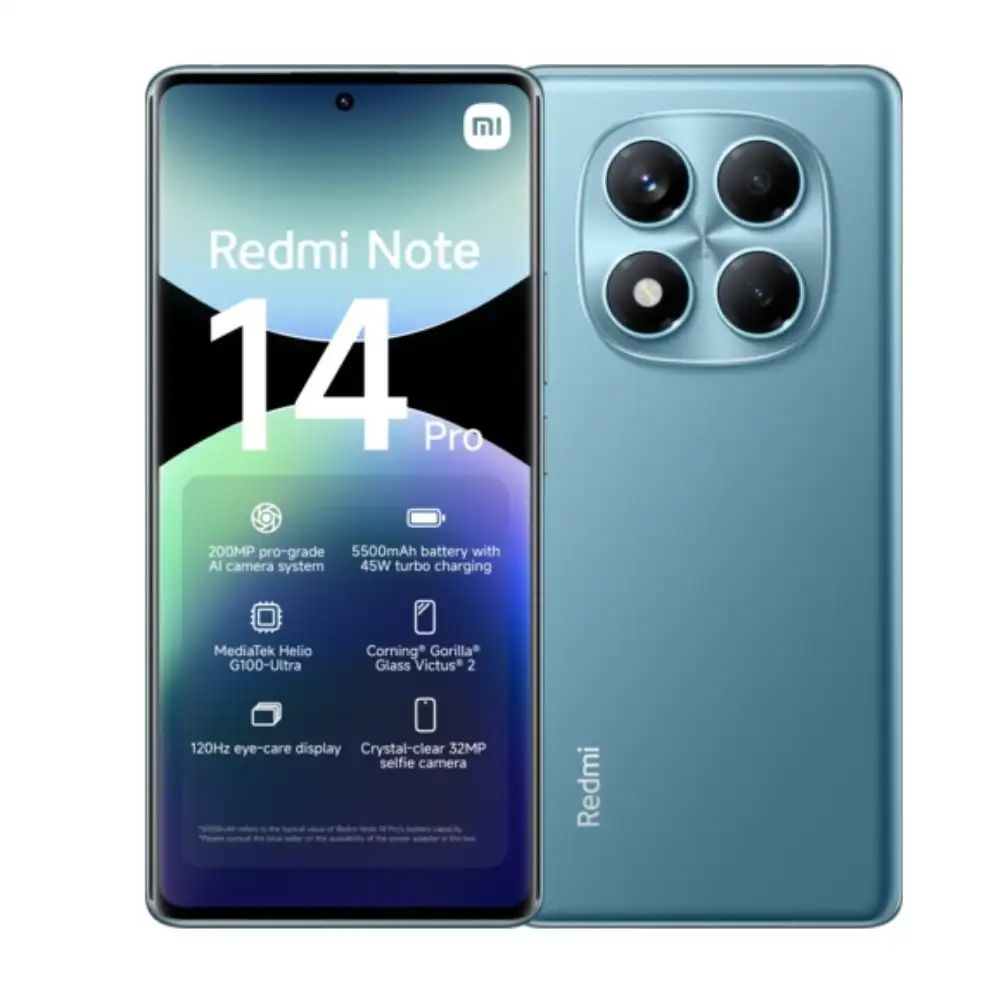 Smartphone Xiaomi Redmi Note 14 Pro 5G 8 GB de RAM, 256 GB de almacenamiento interno, carga rápida y diseño elegante en color azul.