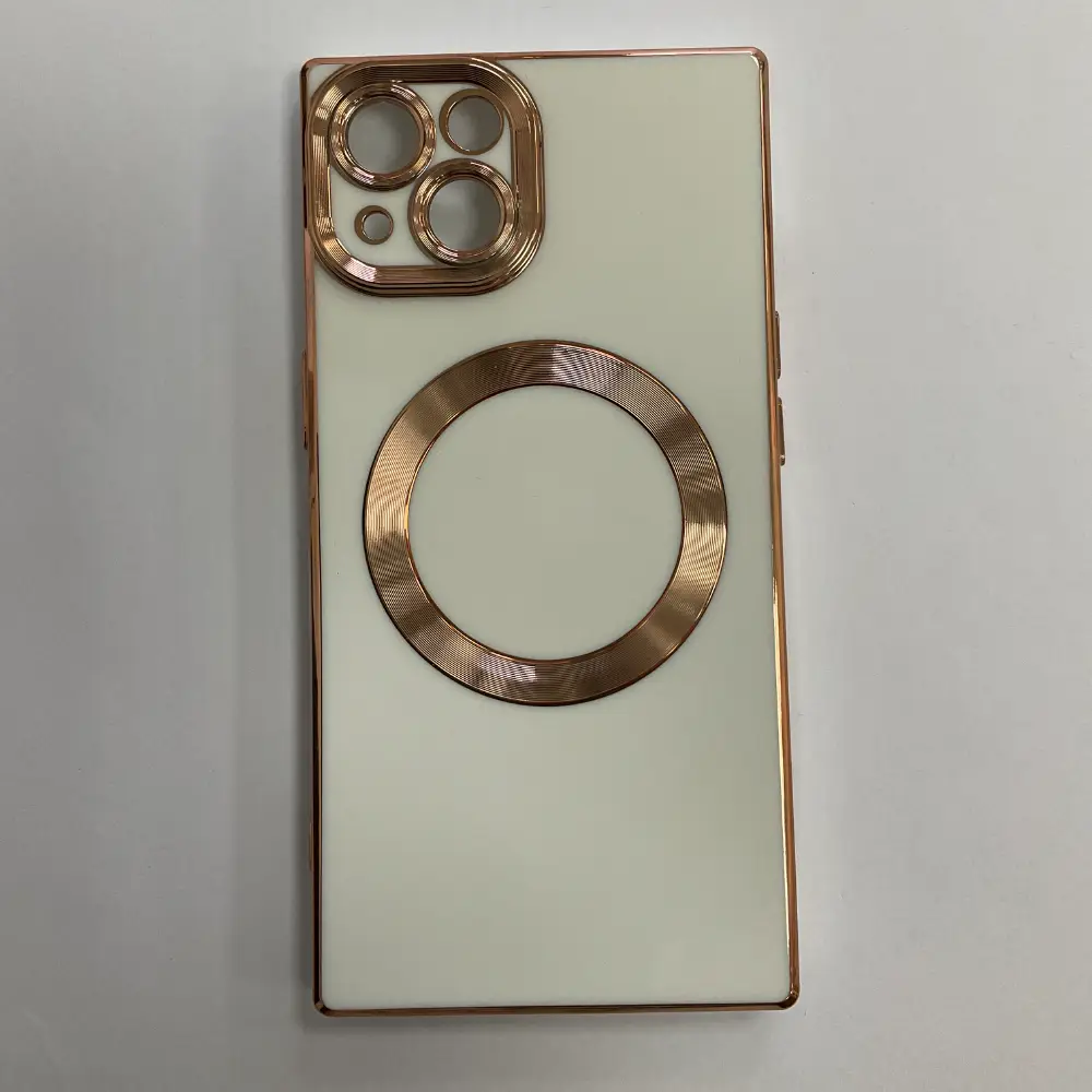 Cover Protectora Blanca con Detalles Dorados para iPhone 15 - Estilo Elegante y Protección Superior