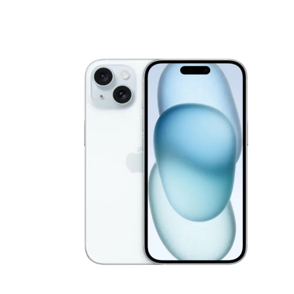 iPhone 15 renovado de 128 GB en azul, con chip A16, cámara de 48 MP, pantalla Super Retina XDR y batería optimizada, compatible con iOS 17 y garantía de 12 meses.