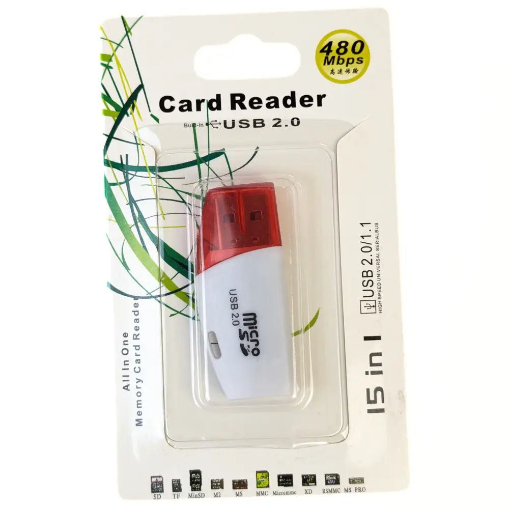 Lector de tarjetas de autos en blanco con tapa roja, ideal para transferencias rápidas y seguras de datos desde tus tarjetas de memoria.