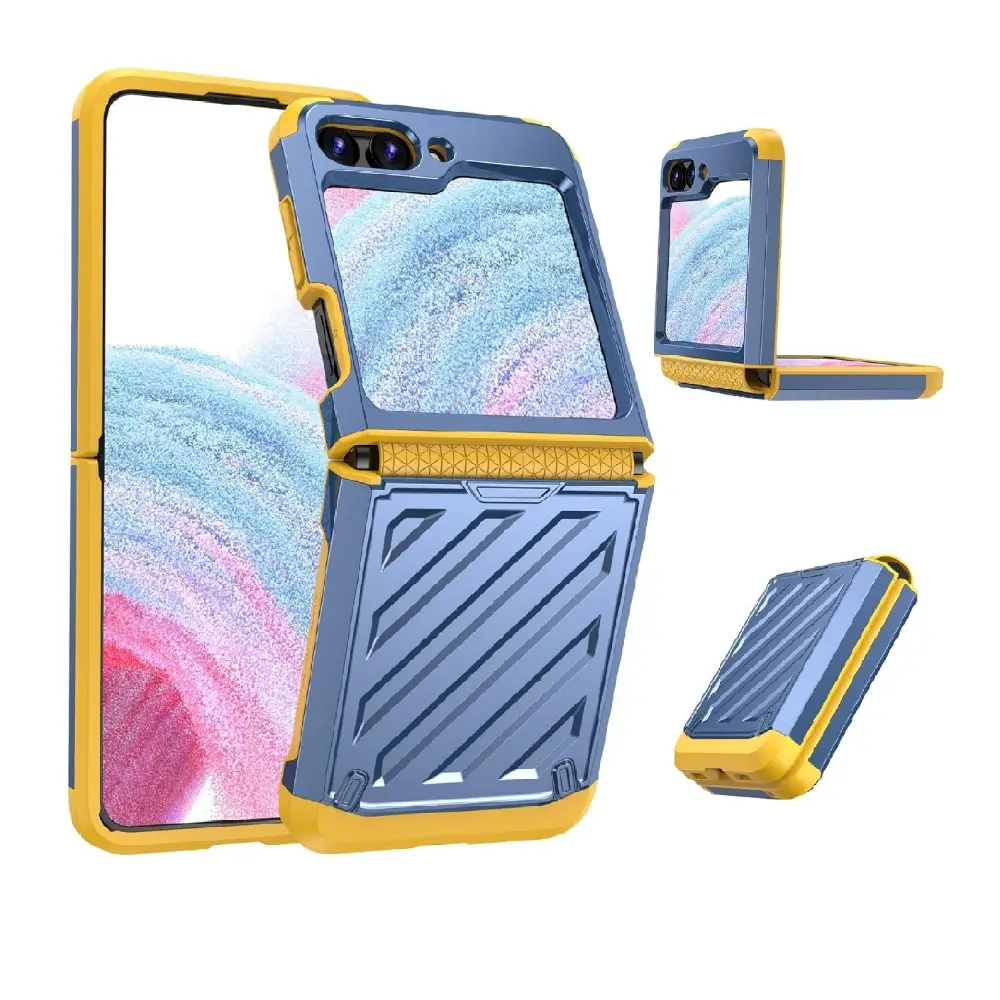 Funda protectora azul para Samsung Galaxy Z Flip 5, ofrece estilo y total protección contra golpes y rayones, ideal para mantener tu dispositivo seguro.