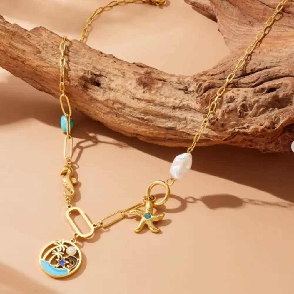 Elegante collar de acero inoxidable con acabado dorado brillante, adornado con delicados dijes de mar que evocan la serenidad del océano, ideal para realzar cualquier atuendo casual o formal con un toque de sofisticación náutica