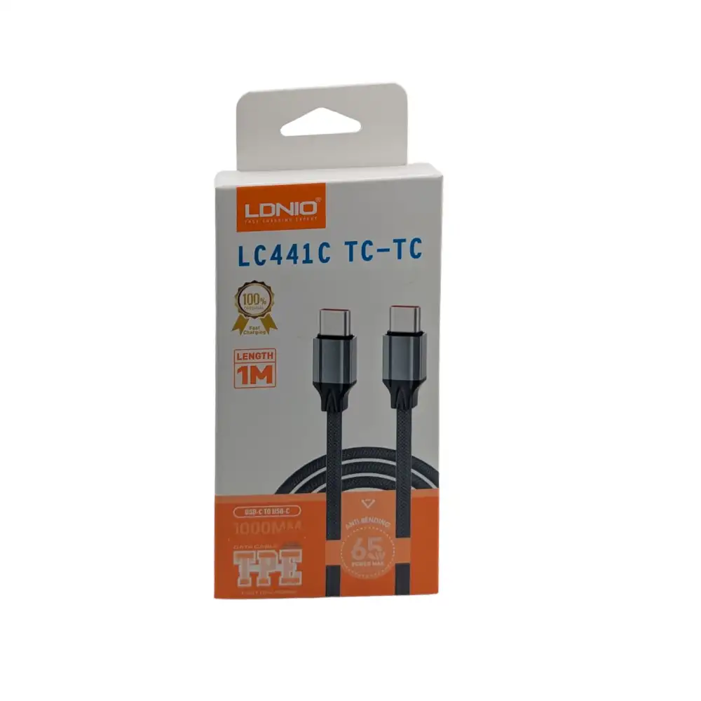 Cable de datos LDNIO modelo LC441C USB‑C a USB‑C de 1 metro, color negro, alta velocidad de transferencia 10 Gbps, compatible con dispositivos USB‑C, construcción robusta con conectores chapados en níquel y blindaje trenzado para máxima durabilidad y rendimiento óptimo en entornos profesionales y domésticos