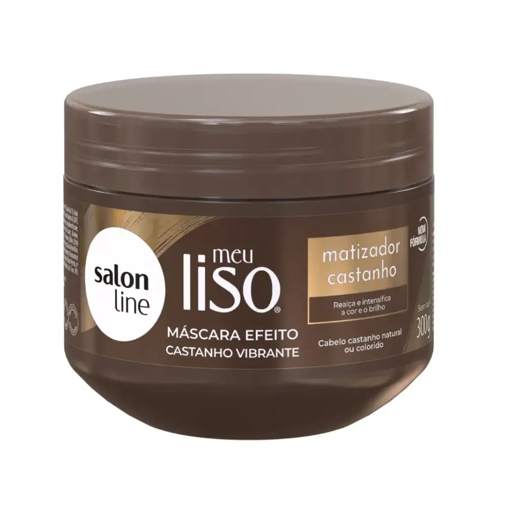 Máscara Capilar Matizadora Salon Line Meu Liso Castaño 300 g: neutraliza tonos amarillos, nutre y brinda brillo intenso para un cabello liso, suave y saludable.