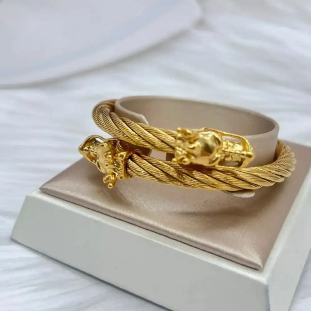 Descubre la pulsera de acero inoxidable dorado ajustable, una pieza elegante y resistente que realza cualquier estilo, perfecta para uso diario o eventos especiales