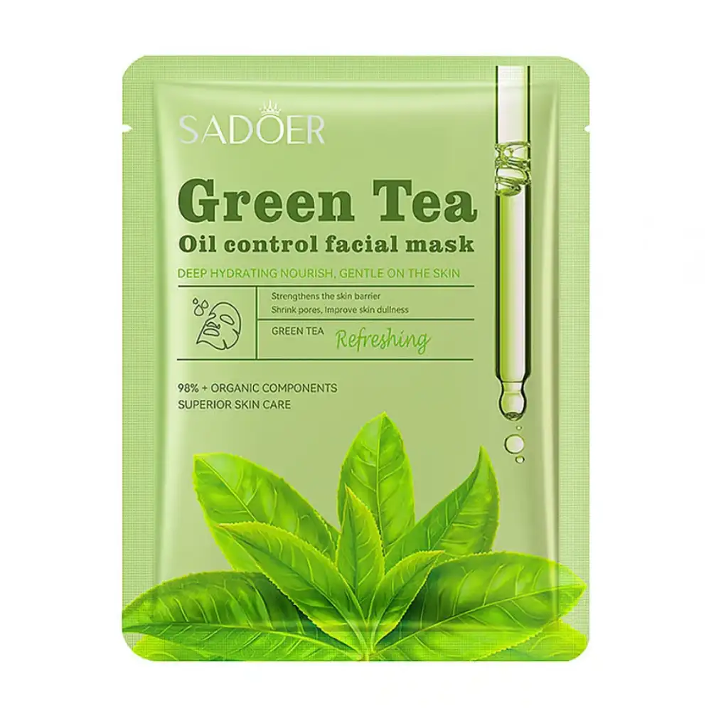 Mascarilla facial de té verde SADOER, antioxidante y hidratante, ideal para piel sensible reduce signos de envejecimiento y brinda luminosidad natural.