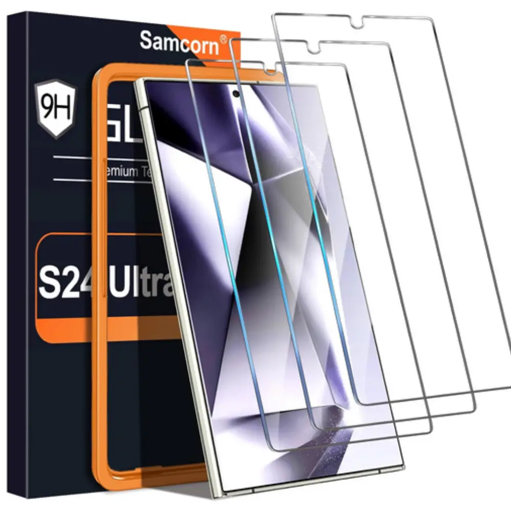 Compra el paquete de 3 protectores para Samsung Galaxy S24 Ultra. Vidrio templado 9H, desbloqueo ultrasónico y compatibilidad con fundas.