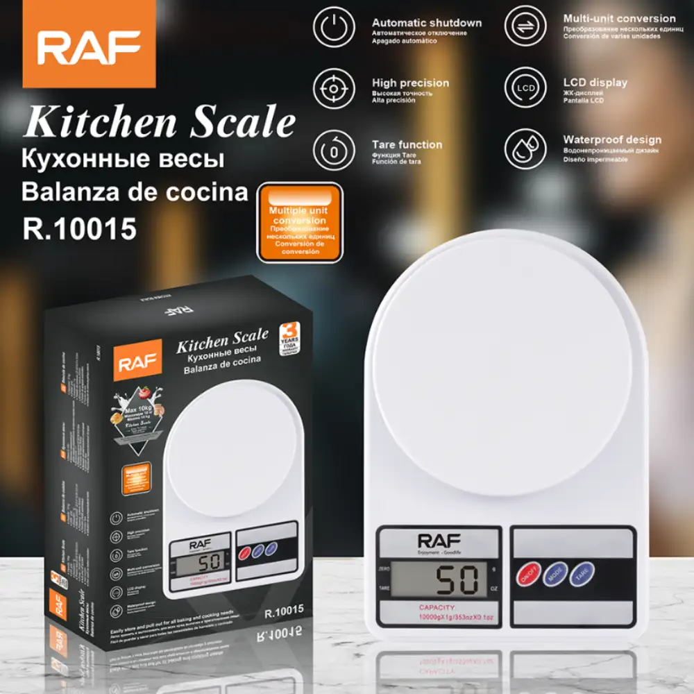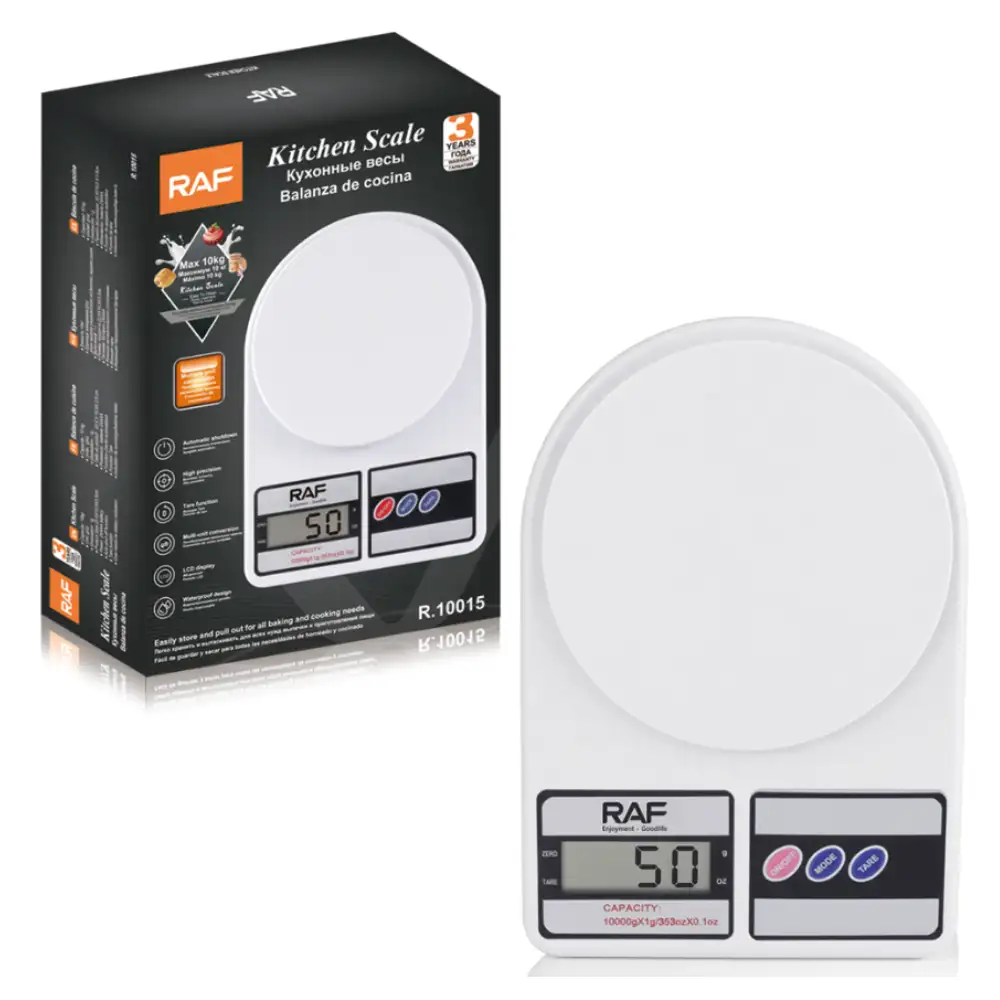 Báscula de Cocina Digital RAF R.10015 – Precisión de 1g, Capacidad de 5kg, Pantalla LCD Retroiluminada, Función Tara y Autoapagado, Diseño Elegante en Color Blanco para Medición Exacta de Ingredientes y Control Nutricional en Hogares y Profesionales