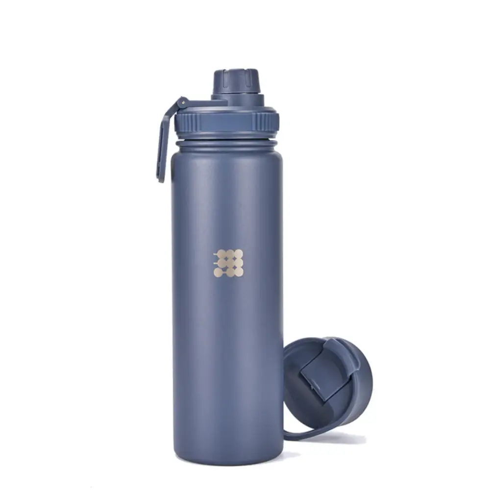 Termo Hydro Bottle 24 onz azul, libre de BPA, acero inoxidable. Mantiene frías las bebidas por 24 horas y calientes por 12. Incluye 2 tapas.