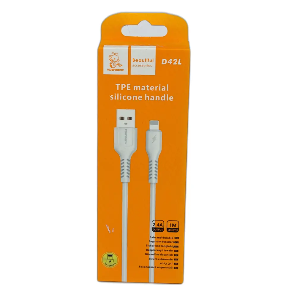 Cable VDENMENV Lightning 2.4 A Modelo D42L, carga rápida y transferencia de datos, resistente y portátil para tus dispositivos Apple.