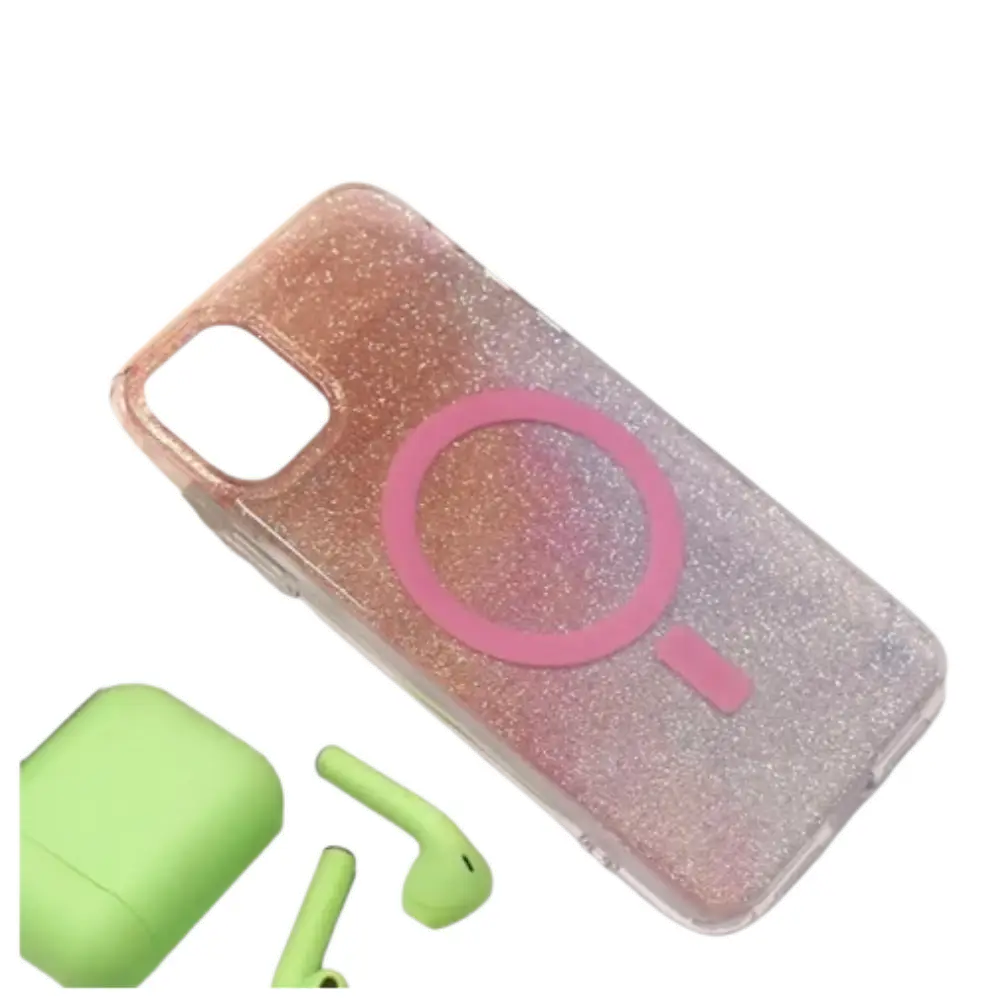 • Diseñada para mantener la estética de tu iPhone, esta funda transparente con escarcha cuenta con imanes integrados que la hacen compatible con accesorios MagSafe.