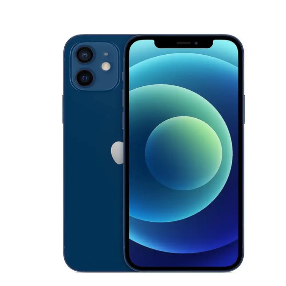 iPhone 12 renovado 64 GB azul con pantalla Super Retina XDR, chip A14 Bionic, cámara dual de 12 MP, certificación IP68 y batería de larga duración, listo con iOS actualizado.