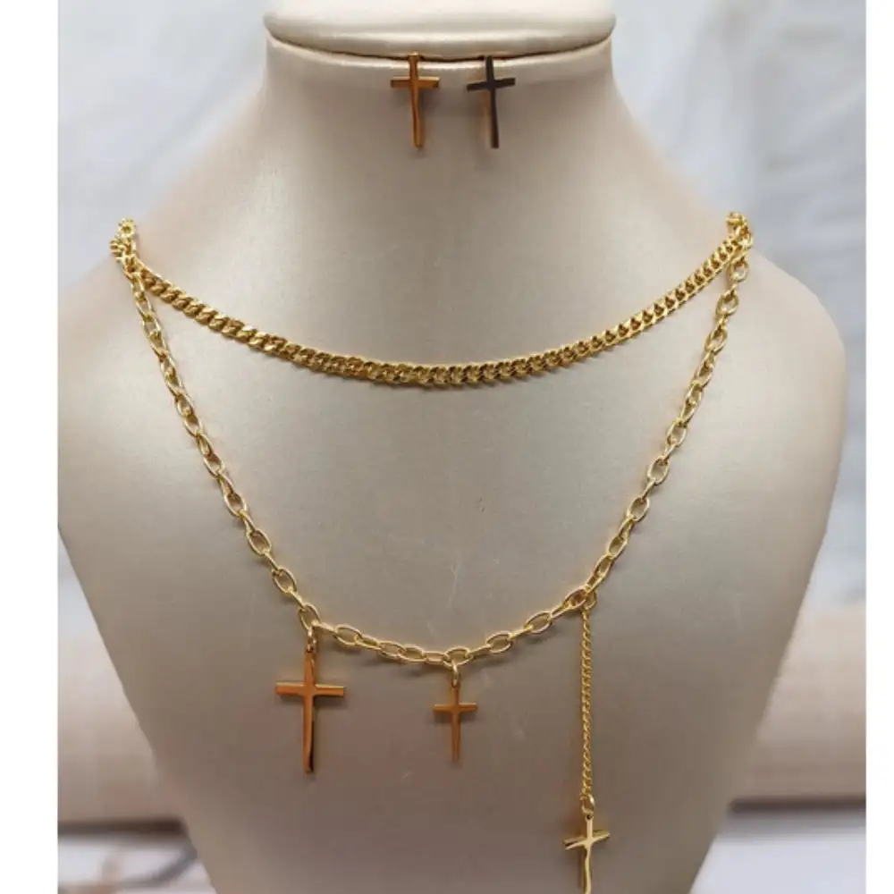 Set de collar y aretes de acero bañado en oro con dijes de cruz, elegante y duradero, ideal para mujer que busca sofisticación en eventos formales o uso diario.
