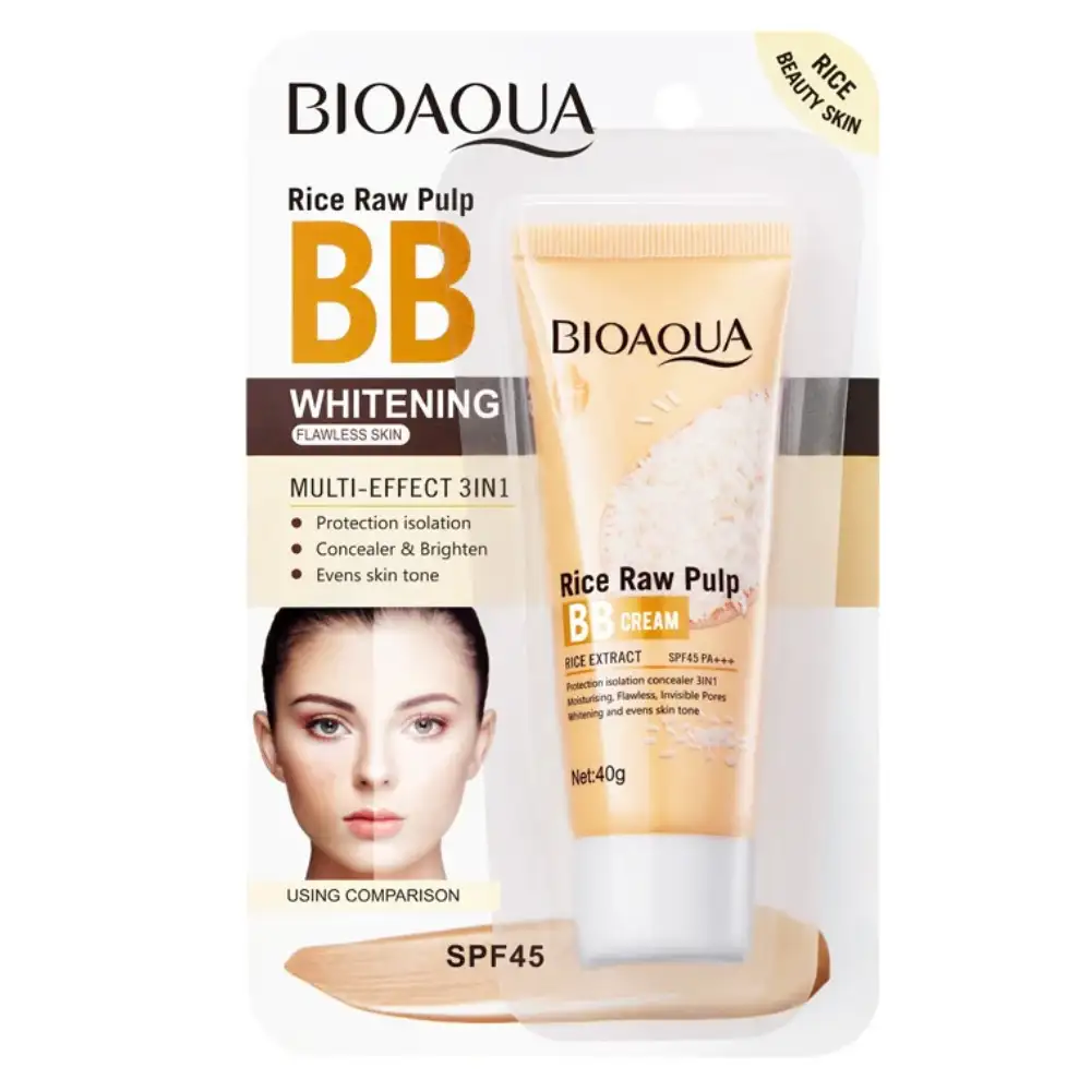 Crema BB BIOAQUA de Pulpa de Arroz Cruda con SPF45 PA+++ – Hidratación profunda, cobertura ligera y protección solar avanzada en presentación de 40 g, ideal para pieles sensibles y con tono uniforme, formulada con ingredientes naturales y libre de parabenos, perfecta para el clima tropical de Panamá