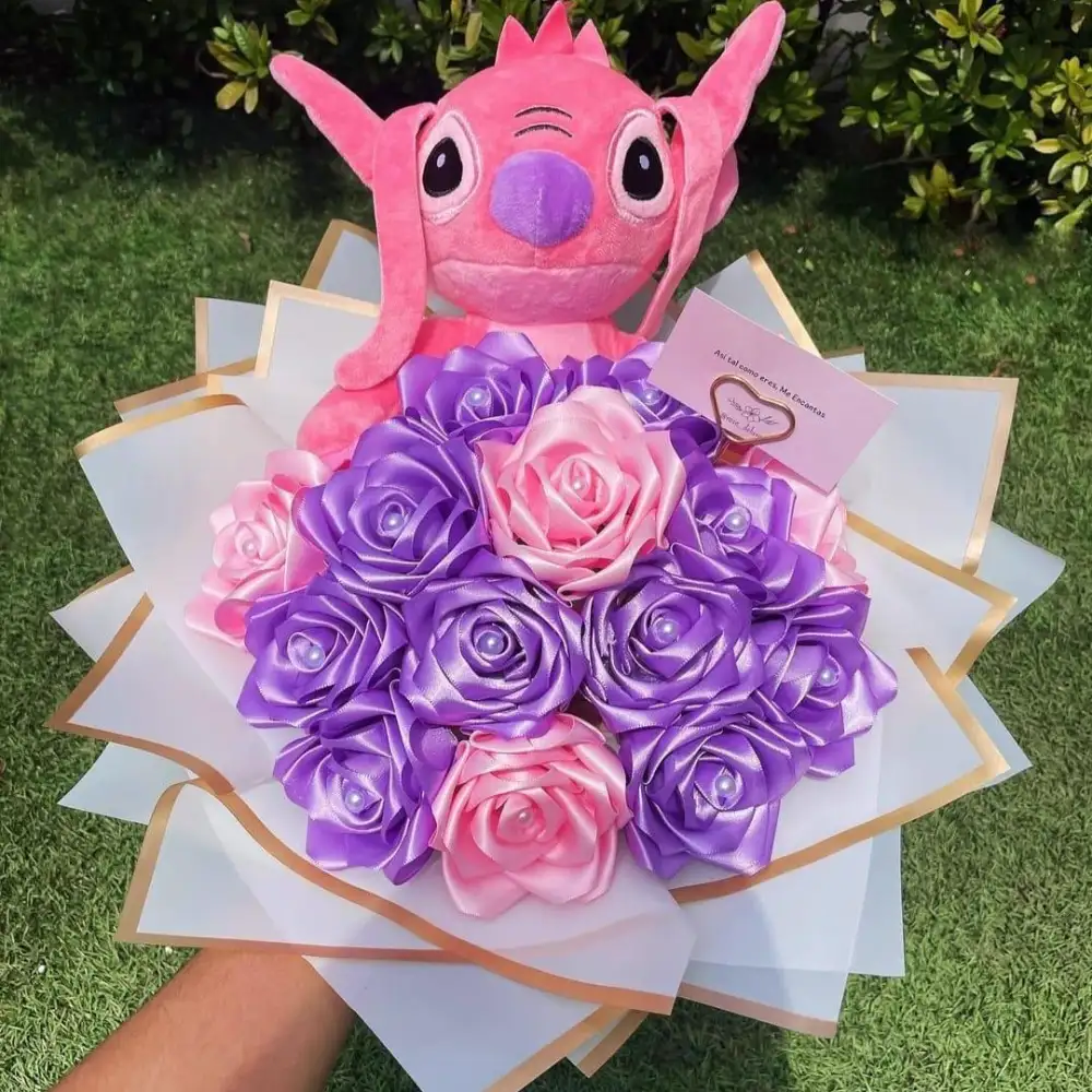 • Incluye un adorable peluche de Stitch, confeccionado con materiales suaves y duraderos, que aporta un elemento lúdico y encantador su expresión amigable y su tamaño perfecto lo convierten en el acompañante ideal para niños y adultos, creando un punto focal atractivo que combina la ternura del personaje con la delicadeza del arreglo floral.