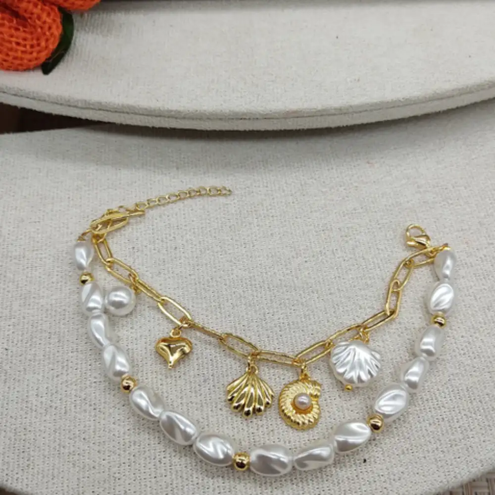 Pulsera de perlas con dijes de concha de mar, elegante y versátil, aporta brillo y sofisticación a cualquier look, perfecta para eventos formales y casuales.