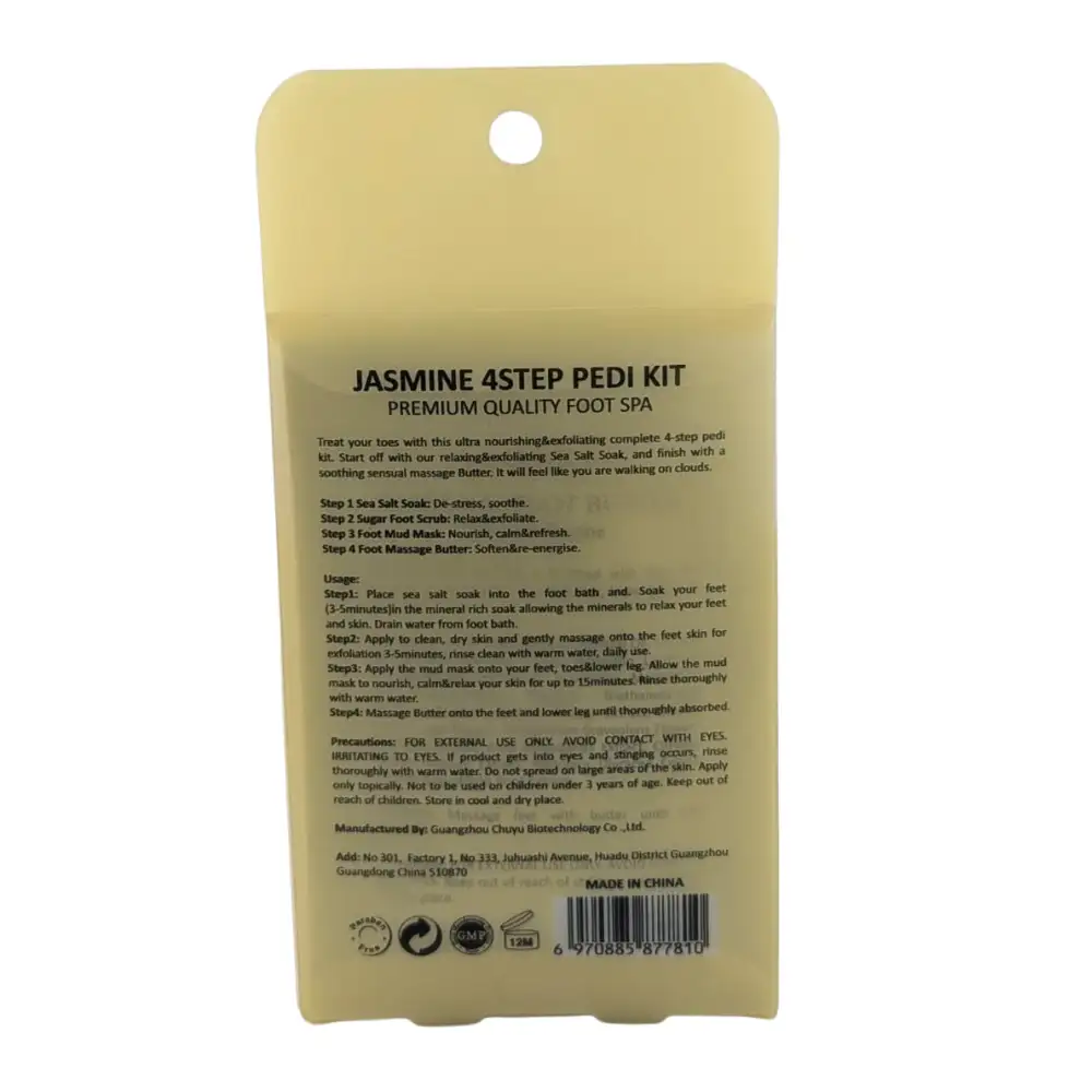 • Este kit de pedicura 4 en 1 Premium reúne todos los elementos esenciales para un tratamiento completo de los pies, incluyendo sales de baño de jazmín, loción calmante, gel herbal desintoxicante y accesorios profesionales cada componente ha sido formulado con ingredientes de alta calidad, libres de parabenos y sulfatos, garantizando una experiencia segura, eficaz y lujosa tanto en entornos domésticos como en salones de belleza, permitiendo revitalizar la piel, aliviar la fatiga y mantener la higiene óptima.