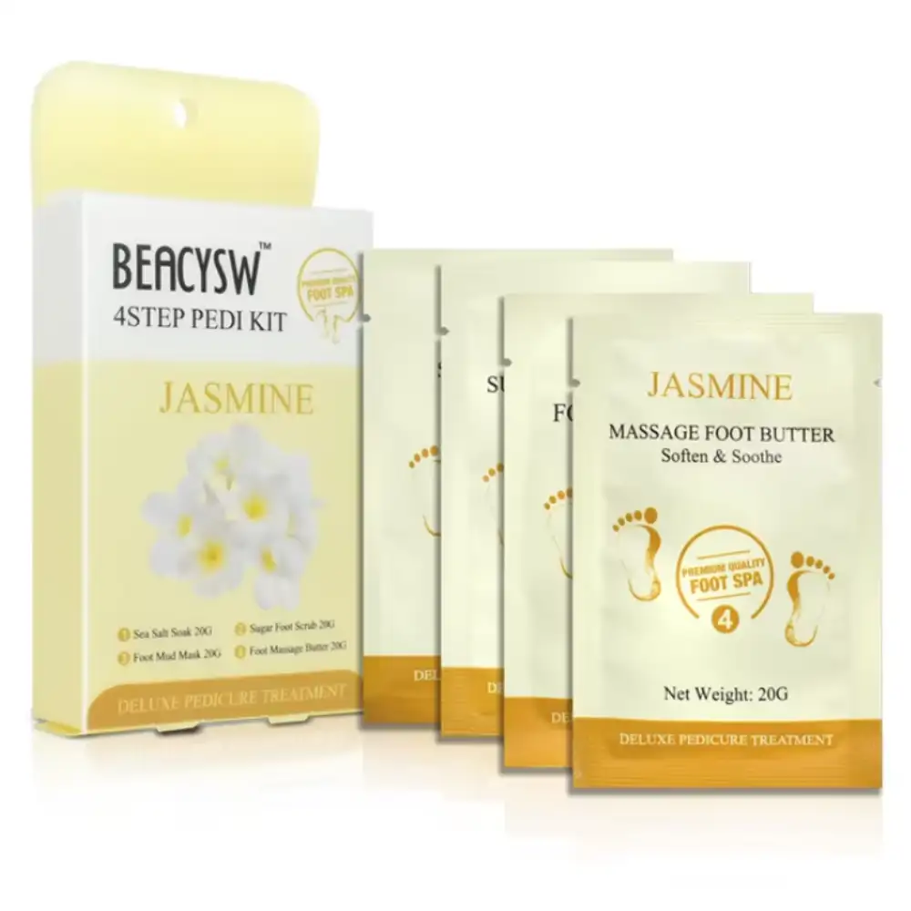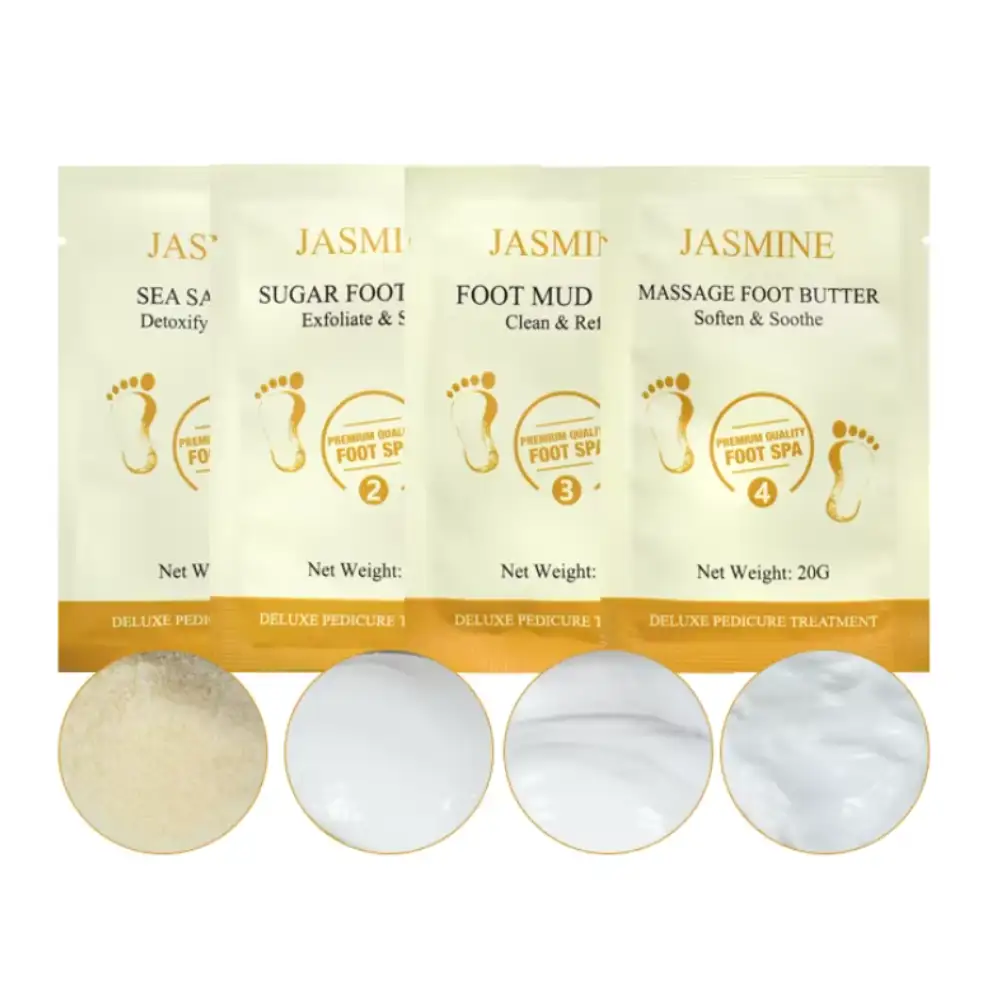 Disfruta de un spa profesional en casa con nuestro Kit de Pedicura 4 en 1 Premium: sales de jazmín, loción calmante, gel desintoxicante y accesorios para pies, ideal para uso personal y salones.