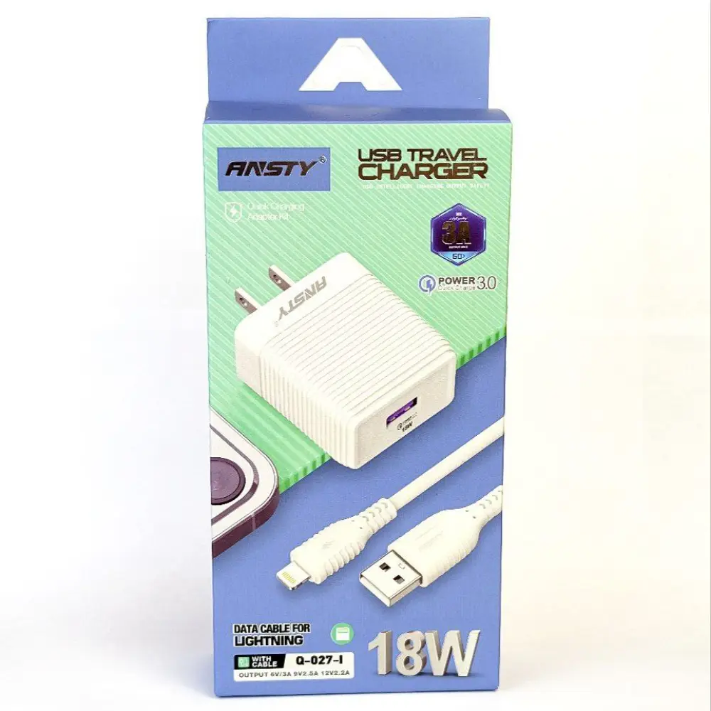Cargador Ansty Q-027-T de 18W y 3A para carga rápida y segura de dispositivos móviles. Tecnología USB Tipo Lightning para mayor compatibilidad.