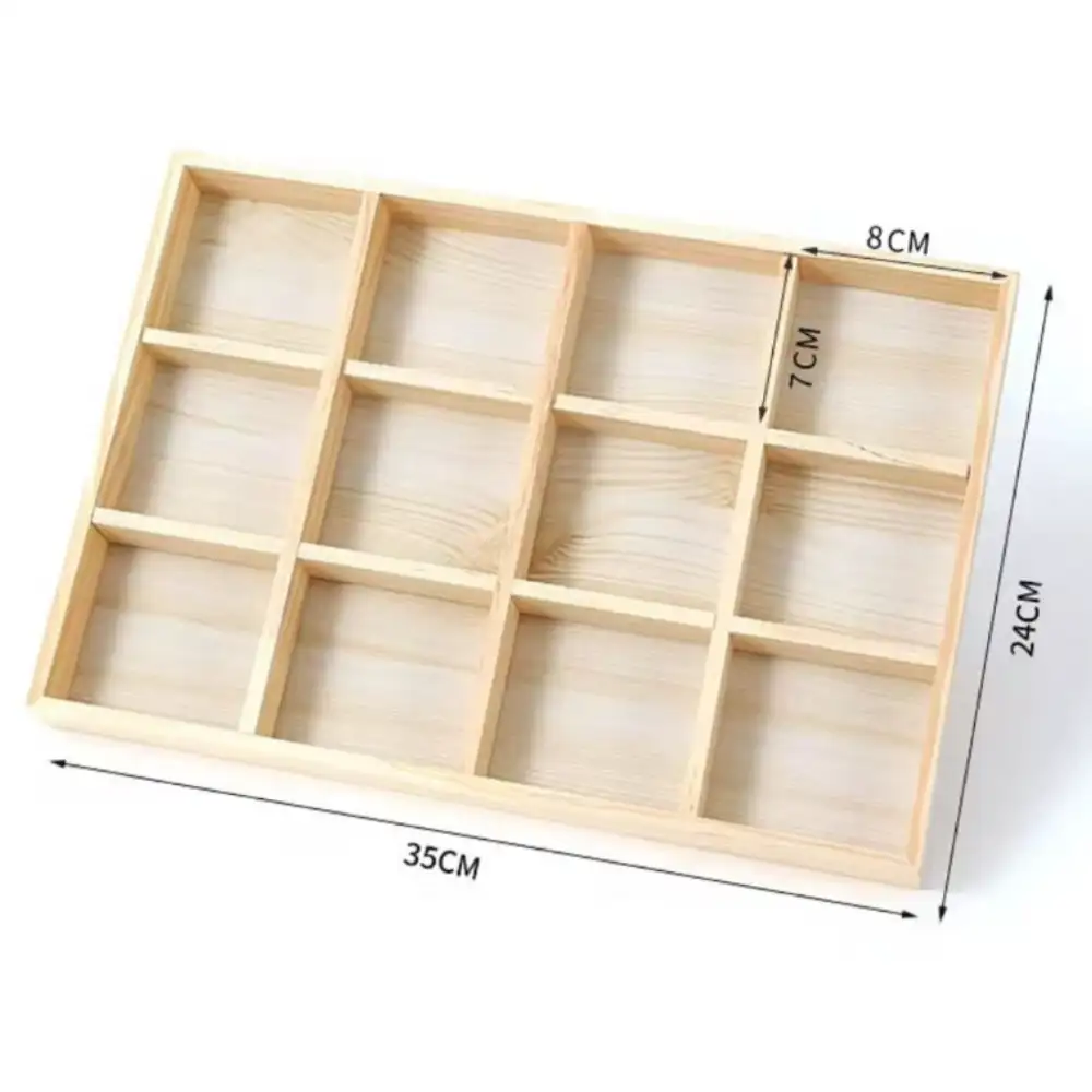 Bandeja organizadora de madera natural con divisiones cuadradas de 8 cm, medida 35 cm × 24 cm, perfecta para separar alimentos, utensilios y accesorios, diseño elegante y duradero ideal para cocinas y comedores panameños