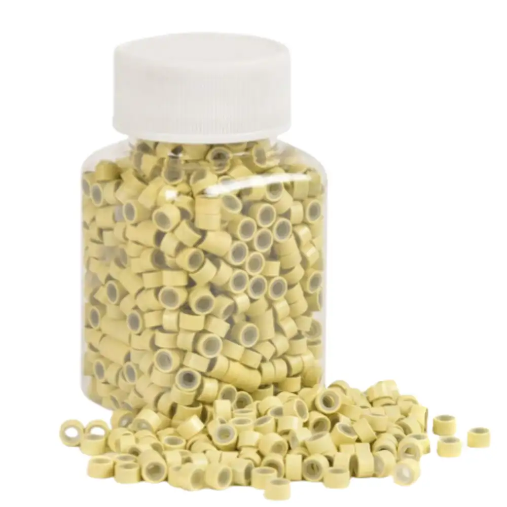 Anillos de silicona premium con microeslabones de 0.197 in, 300 unidades por botella, ideal para extensiones de cabello con punta I, garantizan sujeción segura y acabado natural.