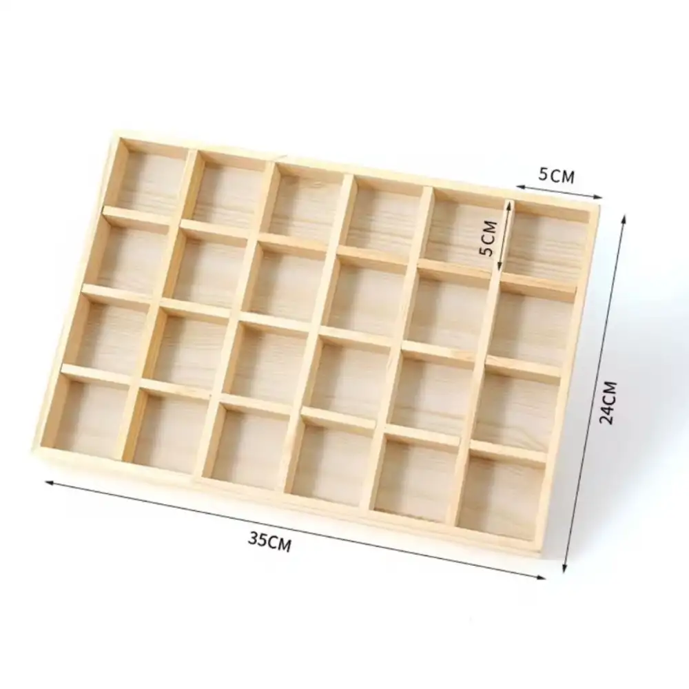 Bandeja organizadora con divisiones de madera natural, 35 cm de largo, 24 cm de ancho, cada compartimento de 5 cm de lado, ideal para separar alimentos, utensilios y accesorios, diseño elegante y duradero para cocinas y comedores