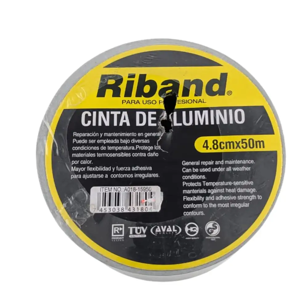 Cinta de aluminio Riband 50 mm x 30 m, alta resistencia y adhesión para proteger contra humedad, aislar térmicamente y usar en aplicaciones industriales, fácil de usar.