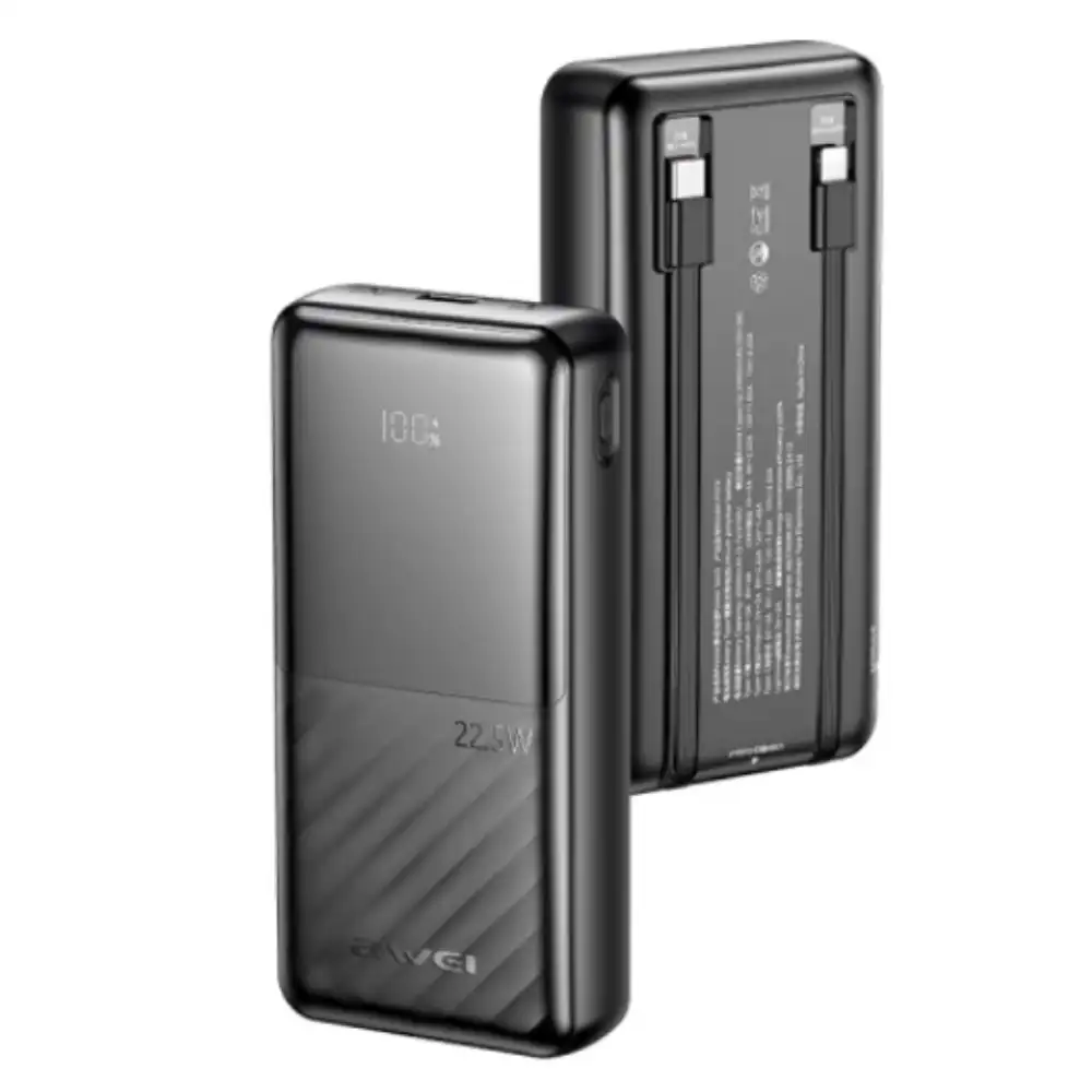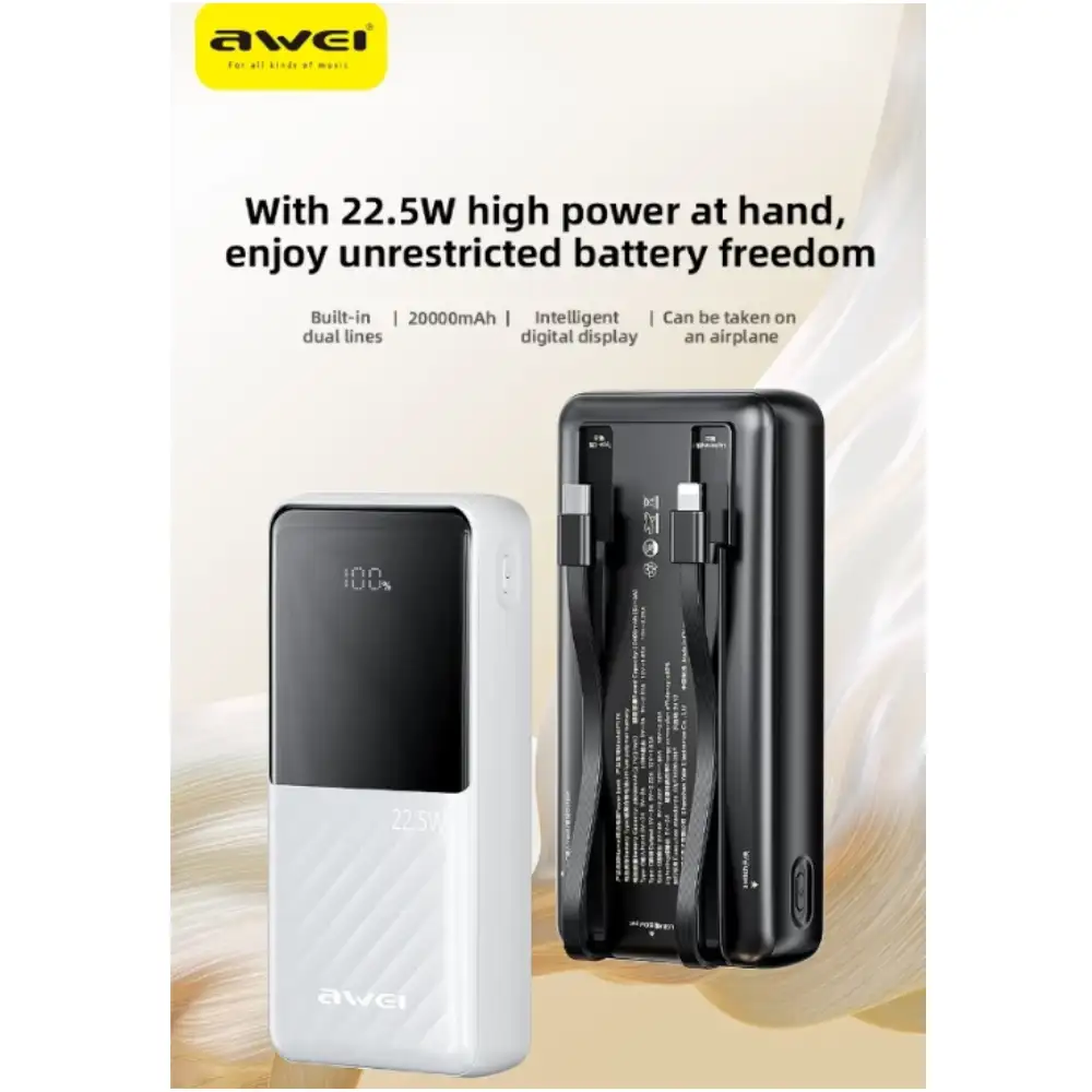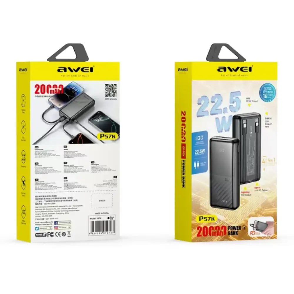 Batería externa Awei P57K de 20000 mAh, puertos Type‑C, Lightning y USB, cable 4‑en‑1 integrado energía prolongada para smartphones y tablets, en cualquier lugar.