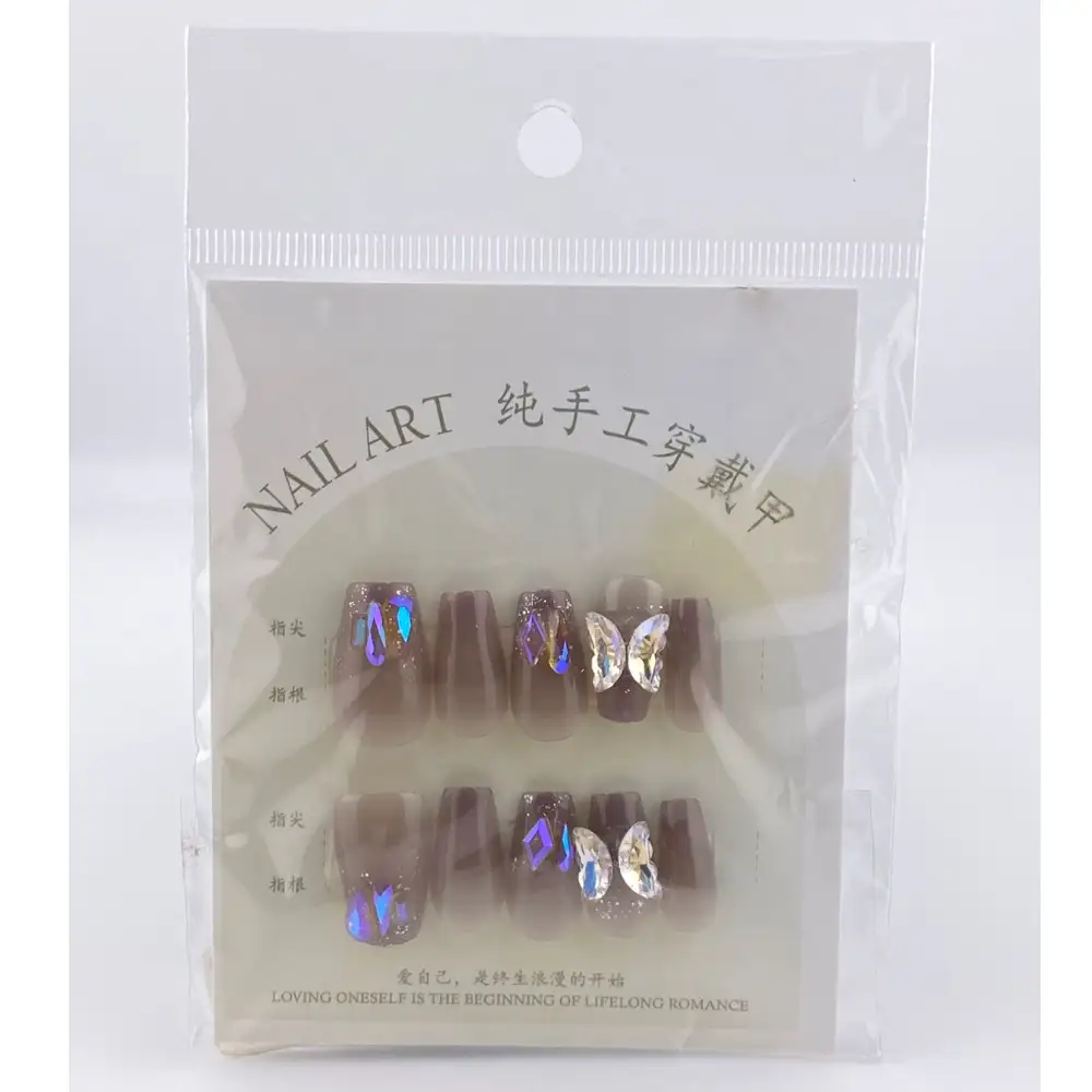 Uñas postizas rectangulares de color marrón con delicados detalles de mariposa, ultra delgadas y flexibles, fabricadas con material de alta calidad para una apariencia natural, perfectas para eventos especiales, uso diario y maquillaje profesional, fácil aplicación y remoción sin dañar la uña natural