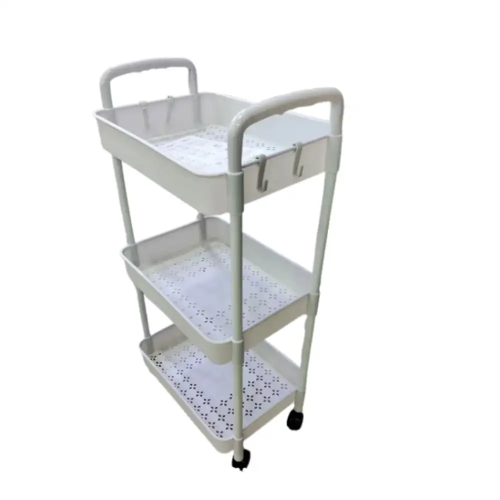 Carrito auxiliar de 3 niveles en color blanco, ideal para organizar herramientas, suministros de oficina, productos de limpieza o artículos domésticos, con estructura robusta de acero y ruedas giratorias de alta resistencia para fácil movilidad en cualquier superficie