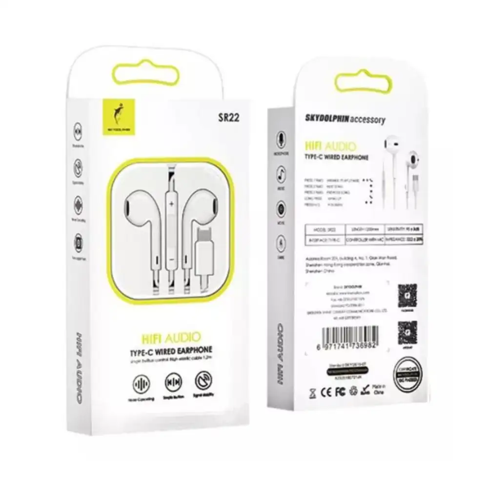 Audífono Tipo C SR22 blanco con diseño ergonómico, sonido de alta fidelidad, conectividad universal y control de volumen ideal para uso diario y deporte.