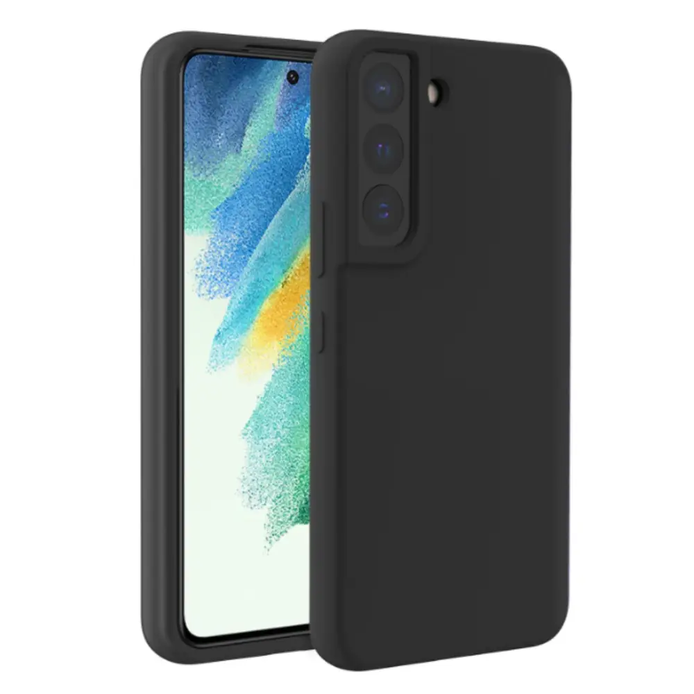 Cover protectora de silicona negro para Galaxy S21 FE, brindando máxima protección contra golpes y rayones con un diseño ligero y elegante.