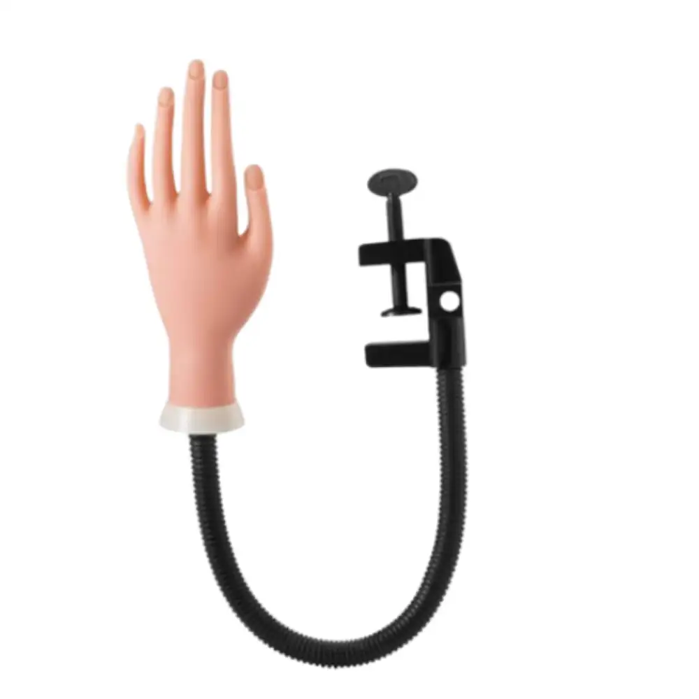 Mano de silicona con soporte ajustable para practicar uñas esculpidas, gelificadas y acrílicas, ideal para perfeccionar técnicas de decoración y modelado con seguridad y realismo.