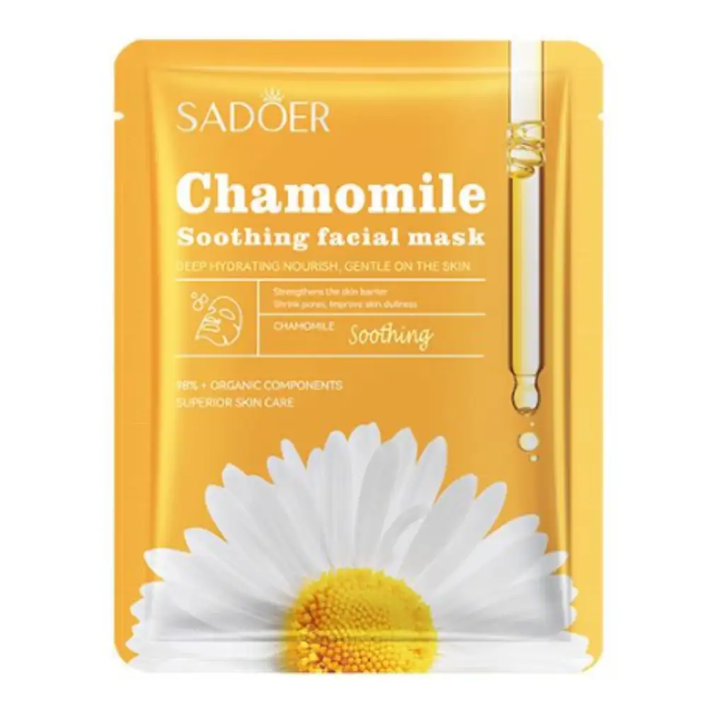 Mascarilla facial de manzanilla SADOER, hidratante y calmante, ideal para piel sensible reduce enrojecimiento, mejora textura y brinda frescura natural en 10‑15 minutos.