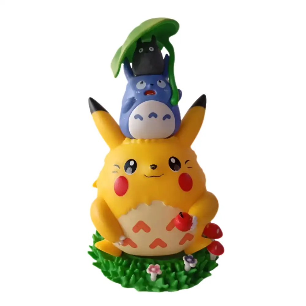 • Figura de colección diorama anime que combina dos personajes icónicos: Pikachu de Pokémon y Totoro de Studio Ghibli, perfecta para fanáticos del mundo del anime y videojuegos que buscan decorar su espacio con piezas exclusivas y de alta calidad.