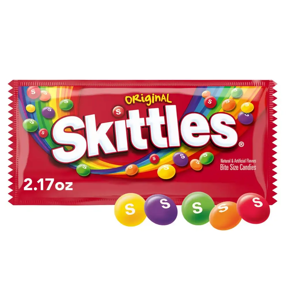 Skittles Original 2.17 oz (61.5 g): caramelos frutales de colores, sellados para máxima frescura, perfectos para fiestas, meriendas y compartir momentos dulces.