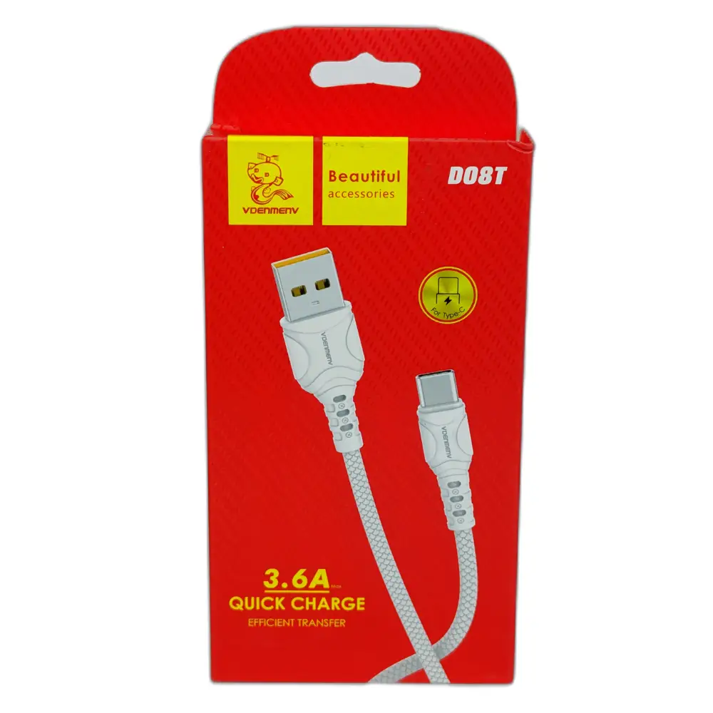 Cable Denmen Tipo C 3.6A Modelo D08T, rápido y duradero. Ideal para cargar y transferir datos de dispositivos móviles con seguridad.