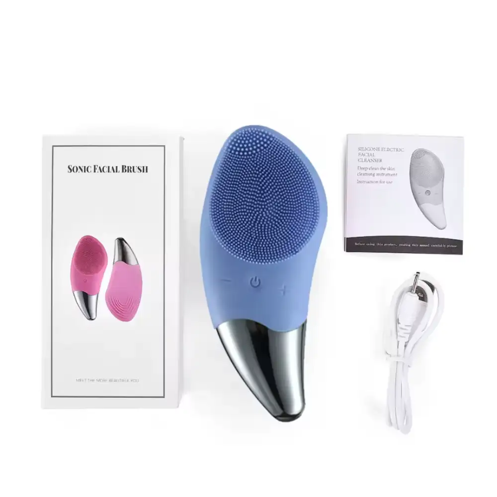Cepillo sónico facial de silicona en azul, con vibración de frecuencia y luz LED que brinda limpieza profunda, exfoliación suave y una piel más radiante.